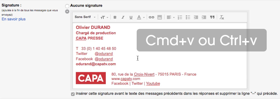 1. Remplissez le formulaire 2. Sélectionnez l'aperçu (entre les 2 blocs gris) et copiez (Cmd+c ou Ctrl+c) 3. Allez dans gmail / paramètres 4. Collez la sélection dans la zone SIGNATURE (Cmd+v ou Ctrl+v)